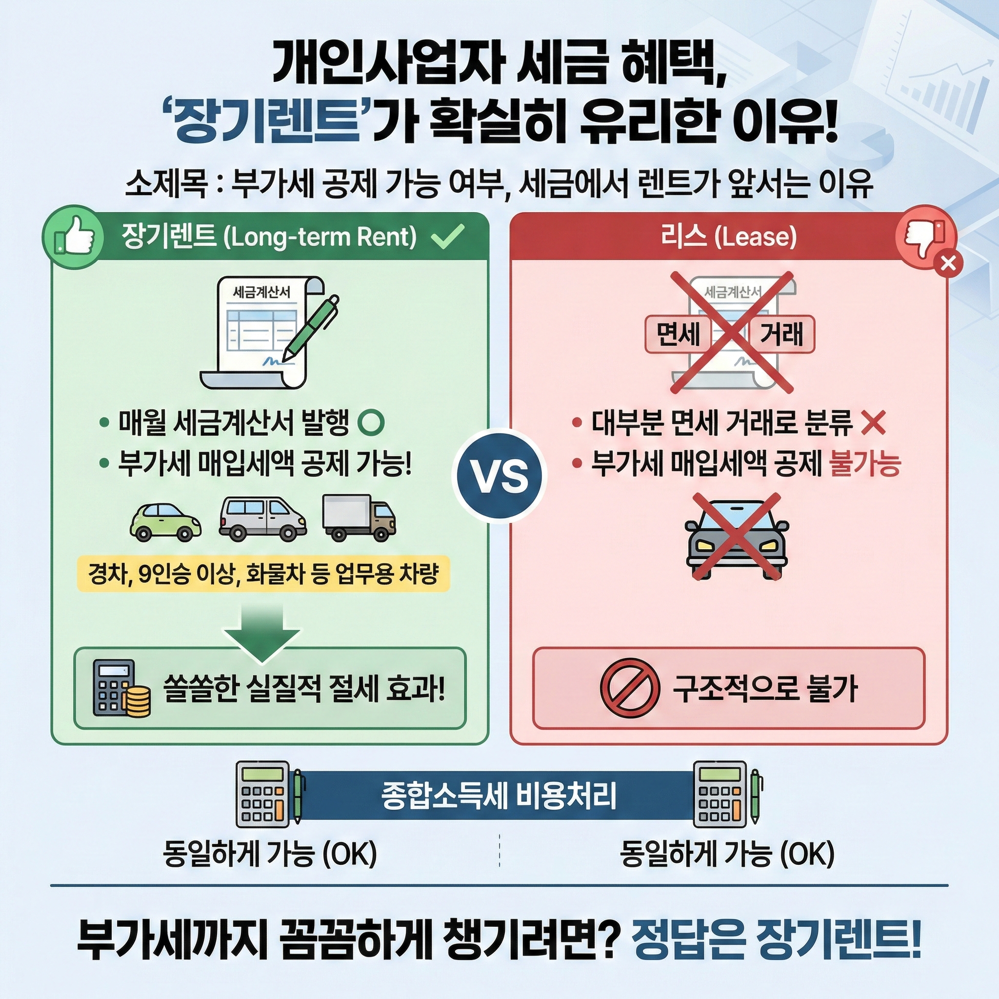 종합소득세 신고 시 비용처리는 렌트와 리스 모두 동일하게 가능하지만, 부가세까지 꼼꼼하게 챙기고 싶으신 분들이라면 렌트 쪽이 확실히 유리한 선택입니다.