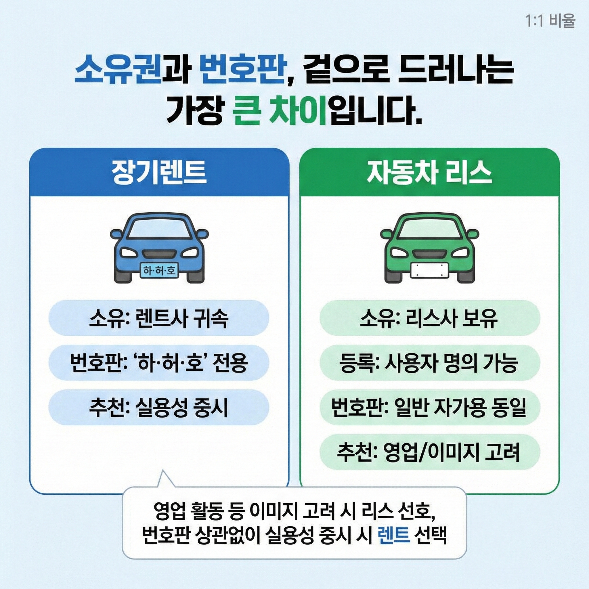 두 방식의 차이 중 눈에 가장 먼저 들어오는 부분이 바로 소유권 구조와 차량 번호판입니다.