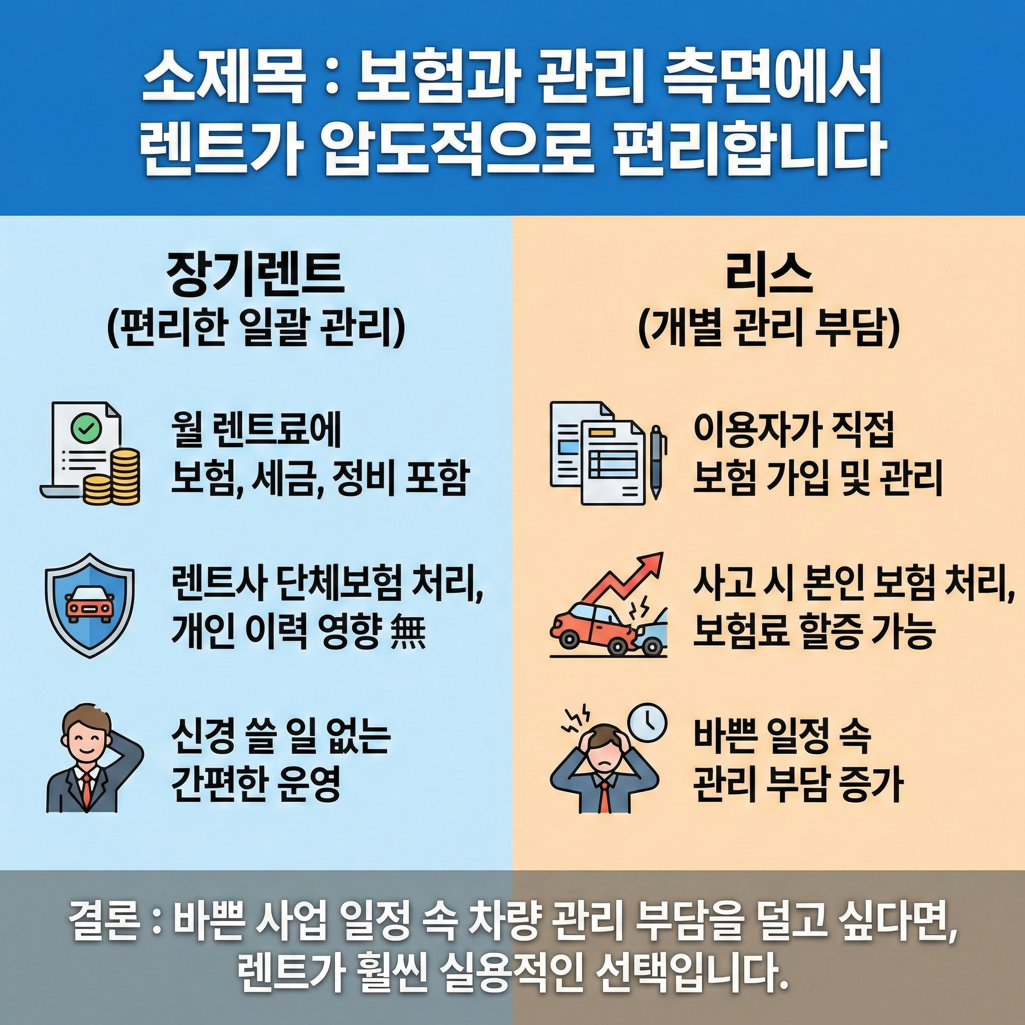 반면 리스는 사용자가 직접 자동차보험에 가입해야 하고, 사고가 나면 본인 보험으로 처리되어 추후 보험료 할증 요인이 될 수 있습니다. 바쁜 사업 일정 속에서 차량 관리까지 일일이 챙기기 어려우신 분들이라면 렌트가 훨씬 실용적인 선택이 될 수 있습니다.