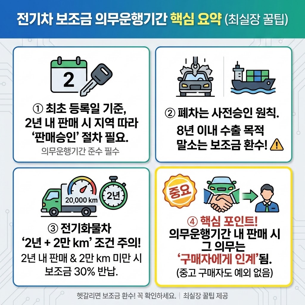 셋째, 전기화물차는 ‘2년 + 2만 km’ 조건이 같이 붙는 경우가 있어요. 2년 안에 팔면서 2만 km 미만이면 보조금 30% 반납 조항이 명시돼 있습니다.