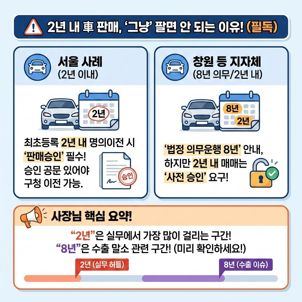 창원 같은 지자체도 “법정 의무운행기간 8년”을 안내하면서, 2년 이내 매매는 사전 승인을 요구하는 식으로 운영합니다.
